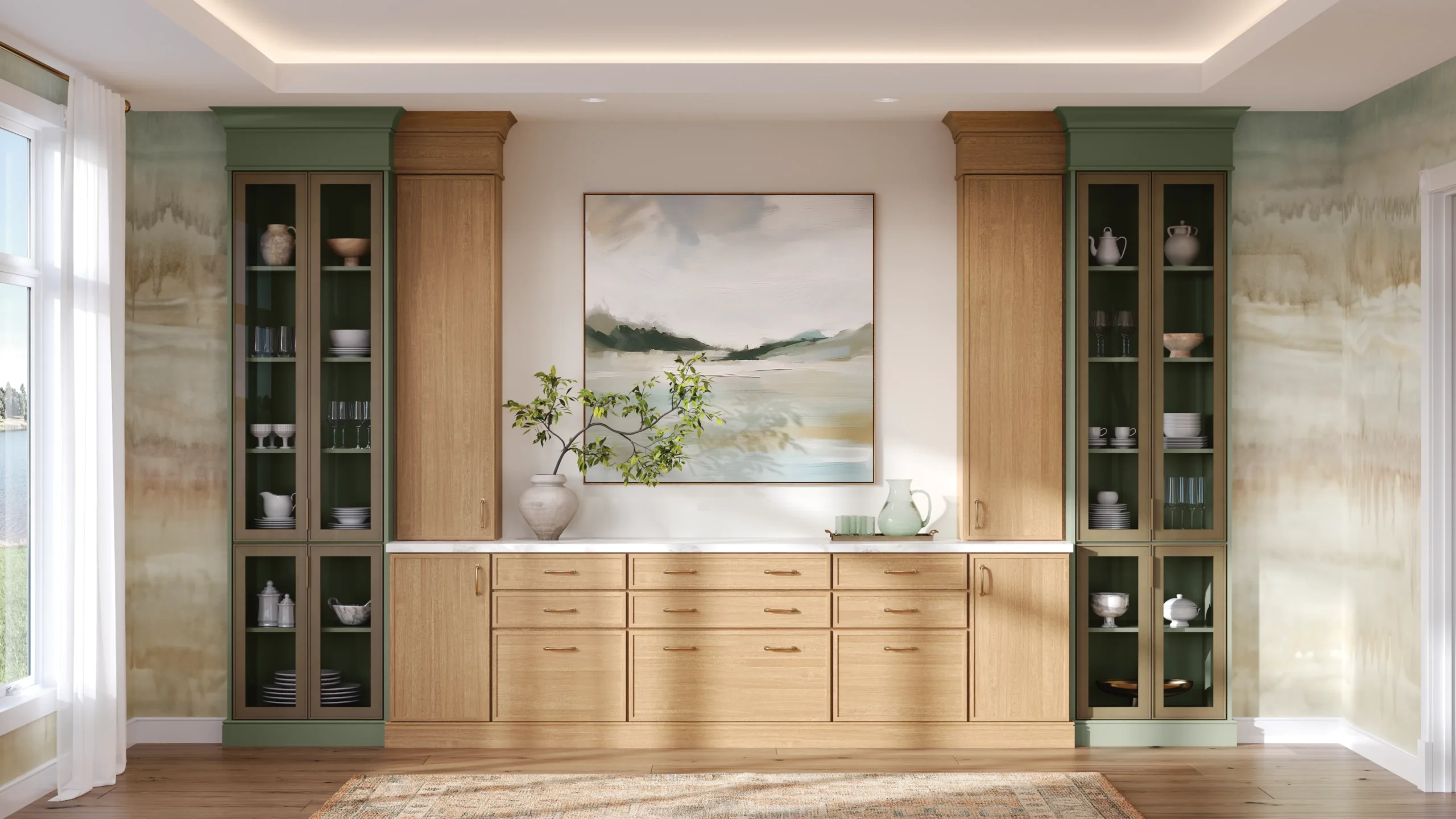 (Gold) Harlan in Irish Creme on maple and Gossamer on quartersawn oak with Bellagio in Onyx and clear glass, prep kitchen: Harlan in Cavern on maple