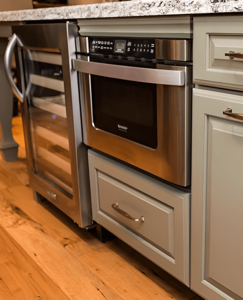 They really needed some additional storage throughout their kitchen, so that was a big consideration. We put a bar fridge in the island to store extra beverages and wine for parties. We incorporated a lot of storage features in the cabinetry too, like space for extra baking sheets and muffin trays above the oven. We also did a tray divider for multiple cutting boards in a base cabinet. There’s pot and pan storage in a drawer under the cooktop. And in the corner, we added a Super Susan.