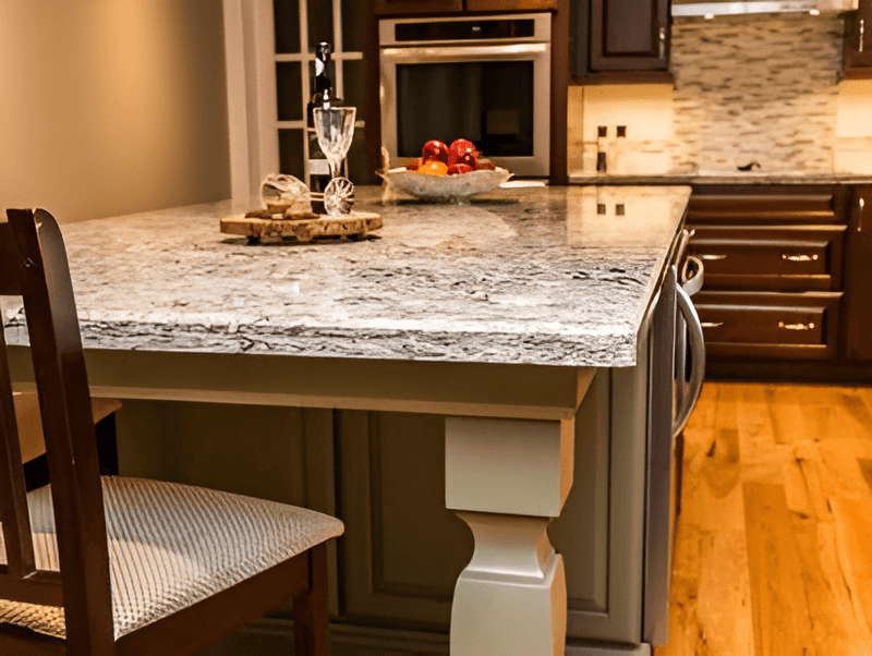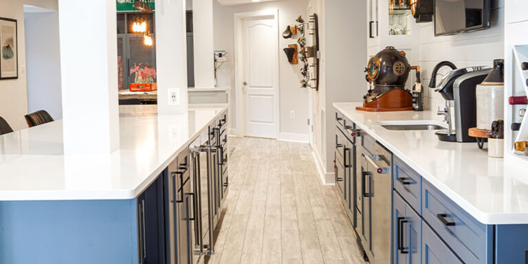 Sure. For the perimeter cabinets we went with the Brookhill raised panel doors in a gingersnap finish. The island also uses the Brookhill raised panel doors, but the finish is sea grass. It works well with the walls, which is a shade called Seaside Memories by Para Paints. Our countertop is Cambria Bellingham, and the floor is a 5” wide distressed hickory that adds a lot of warmth to the area.