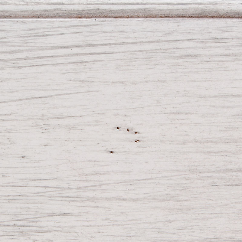 A cool white base color with warm grey and deep brown hand-applied accents and features.