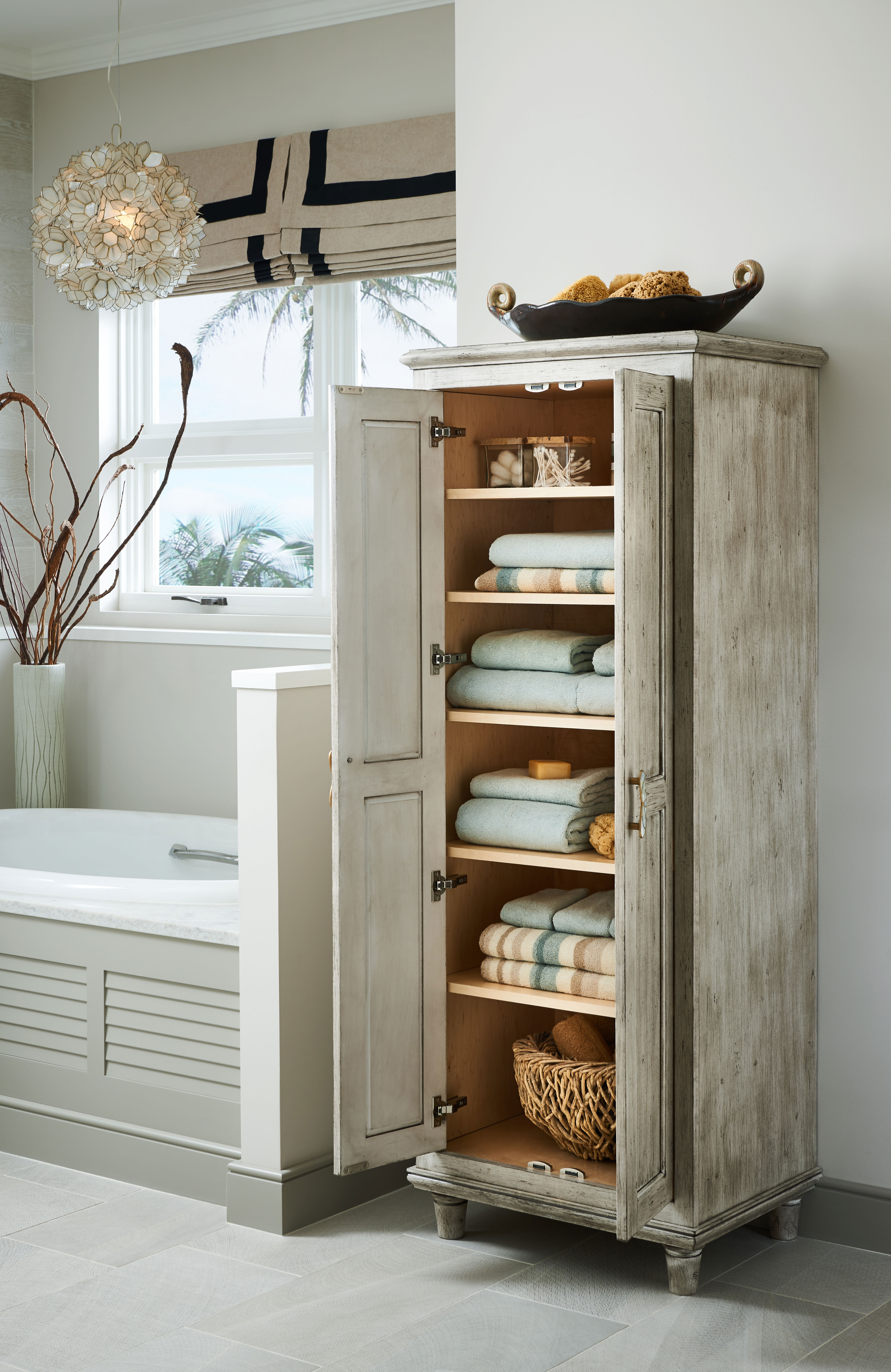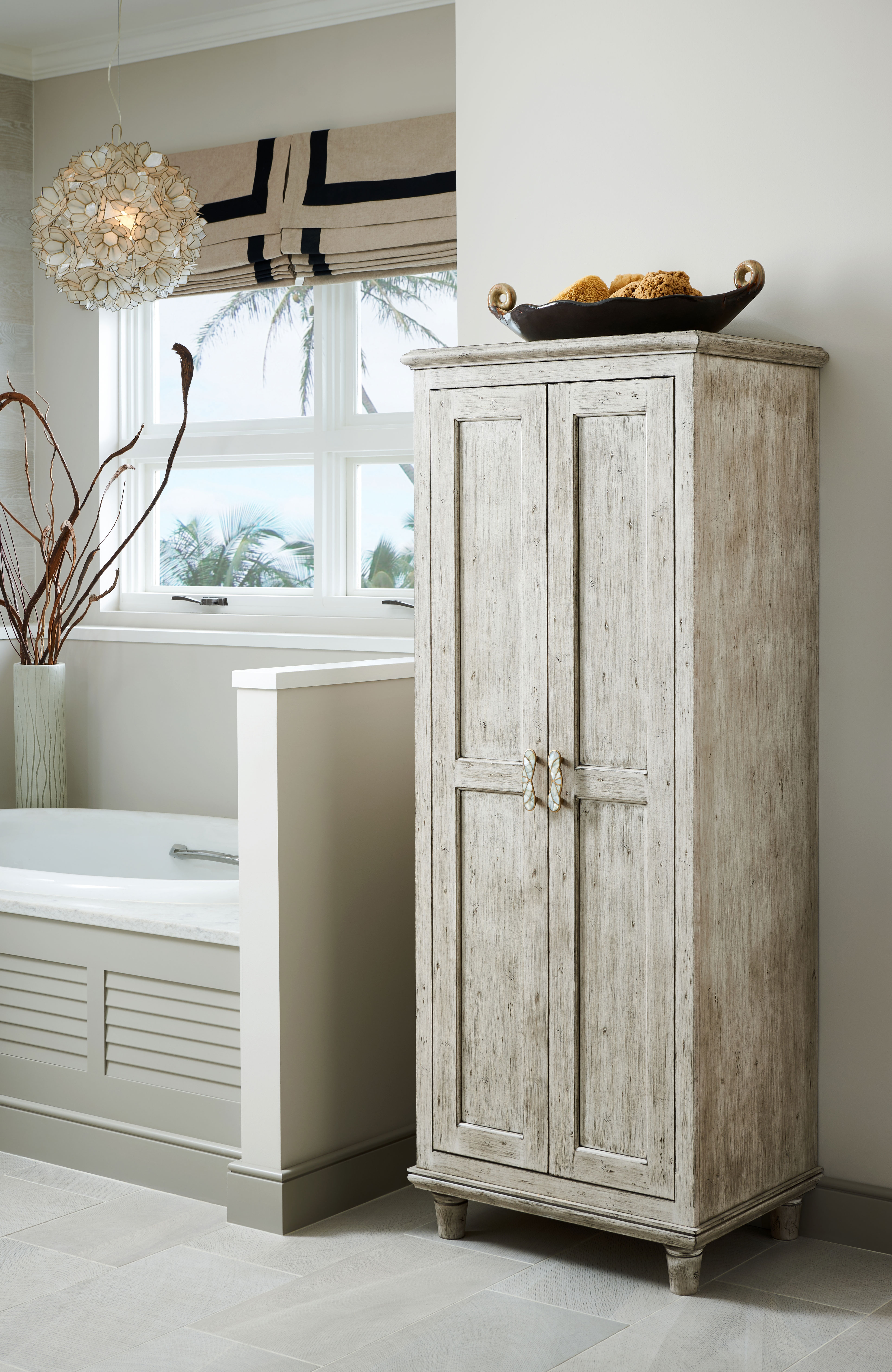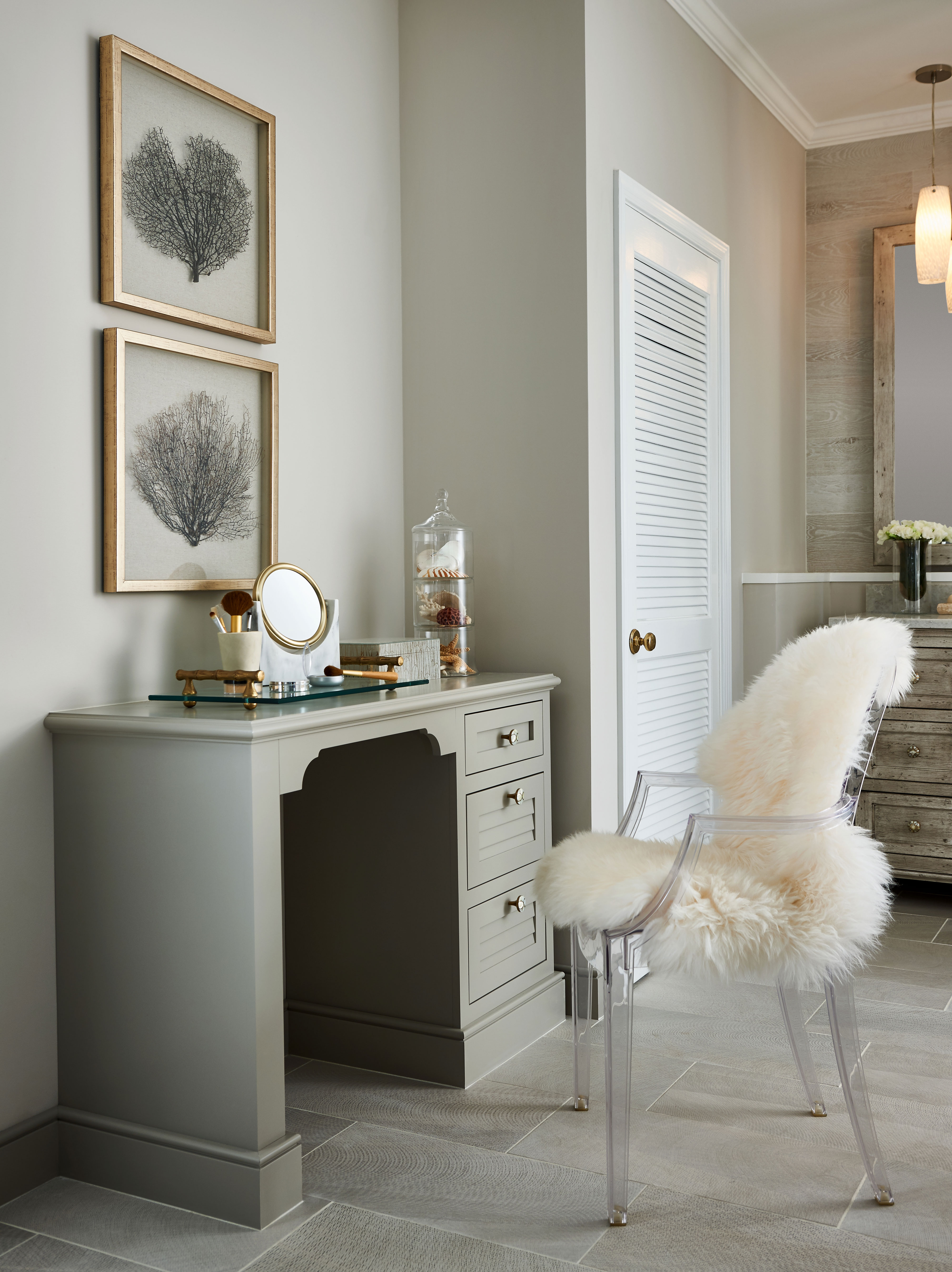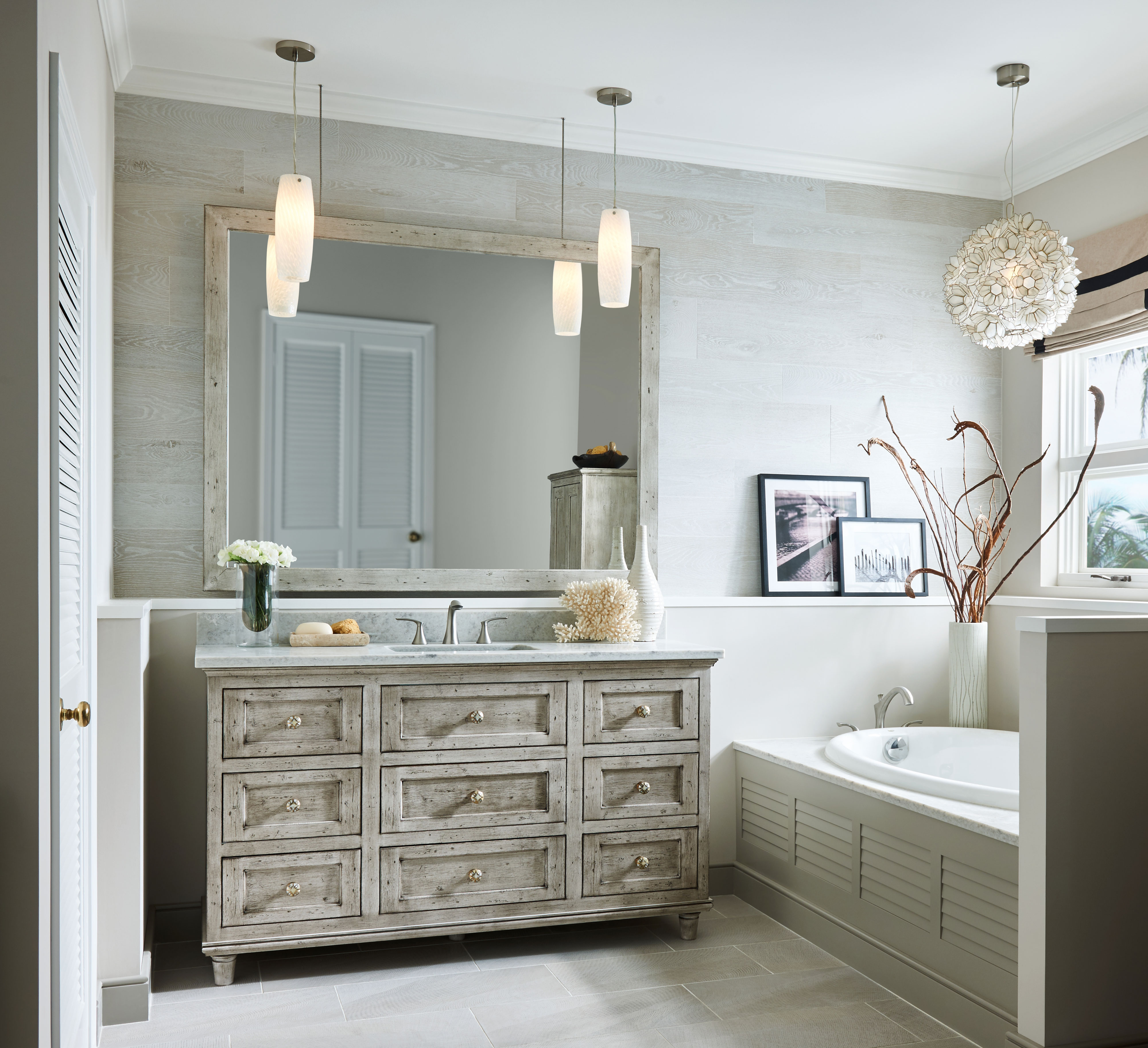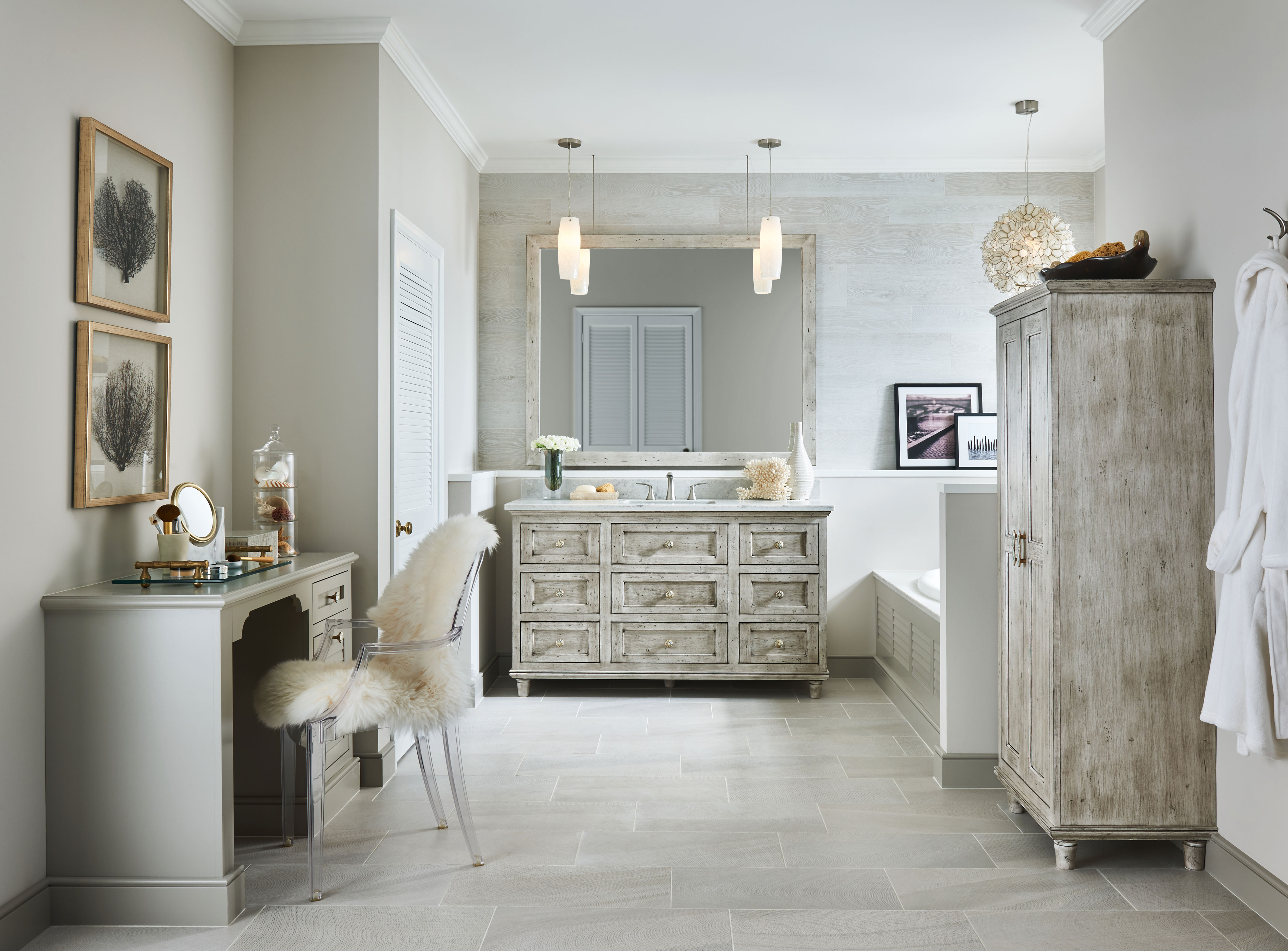 Silver Appaloosa, accents of louvers and wood-grain plank wall tile come together in this glamorous design. The bureau style vanity evokes the look of a treasured heirloom while a neutral color palette is complemented by gold tones, warm lighting and contrasting cool white elements for a modern meets vintage Galleria inspired room.