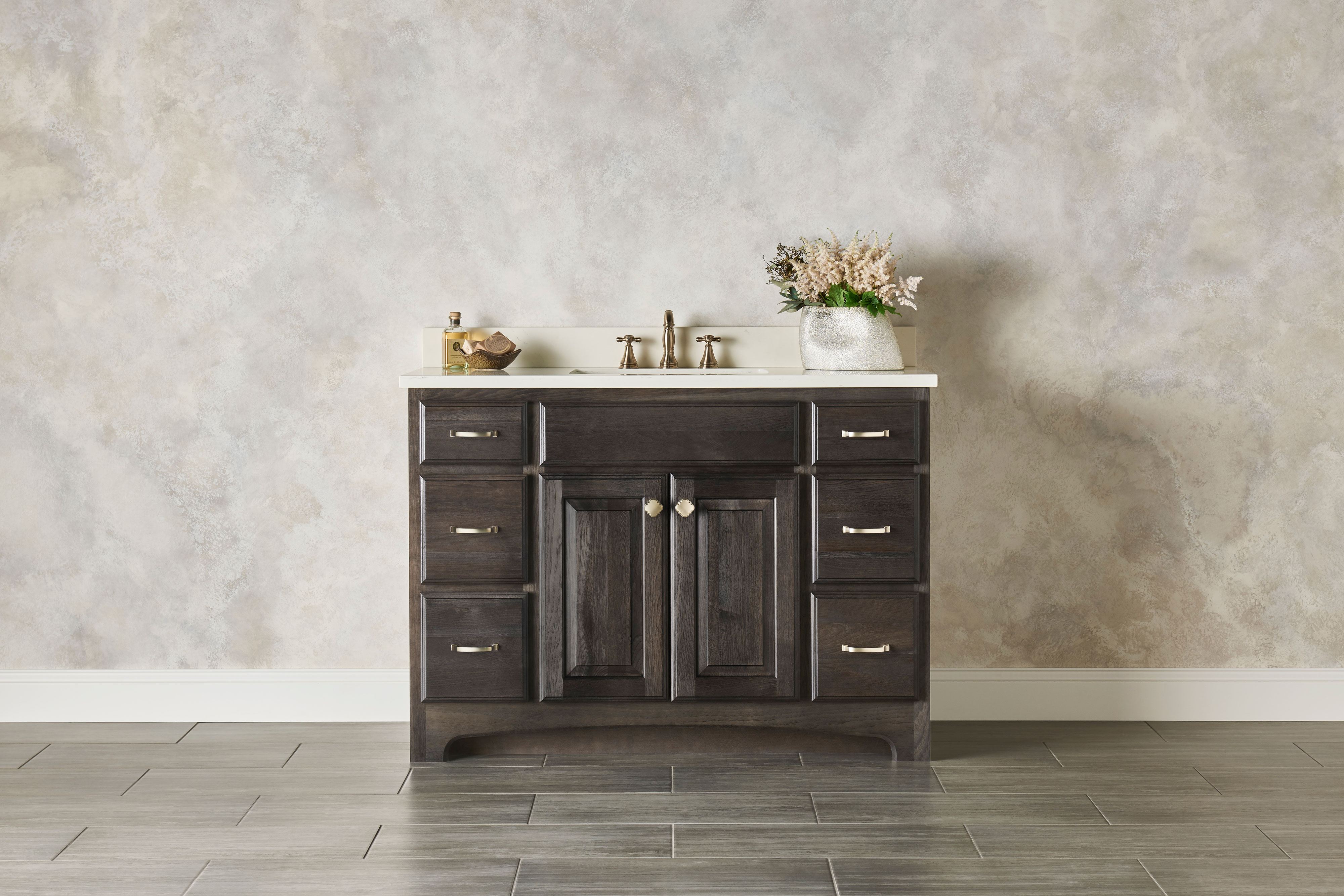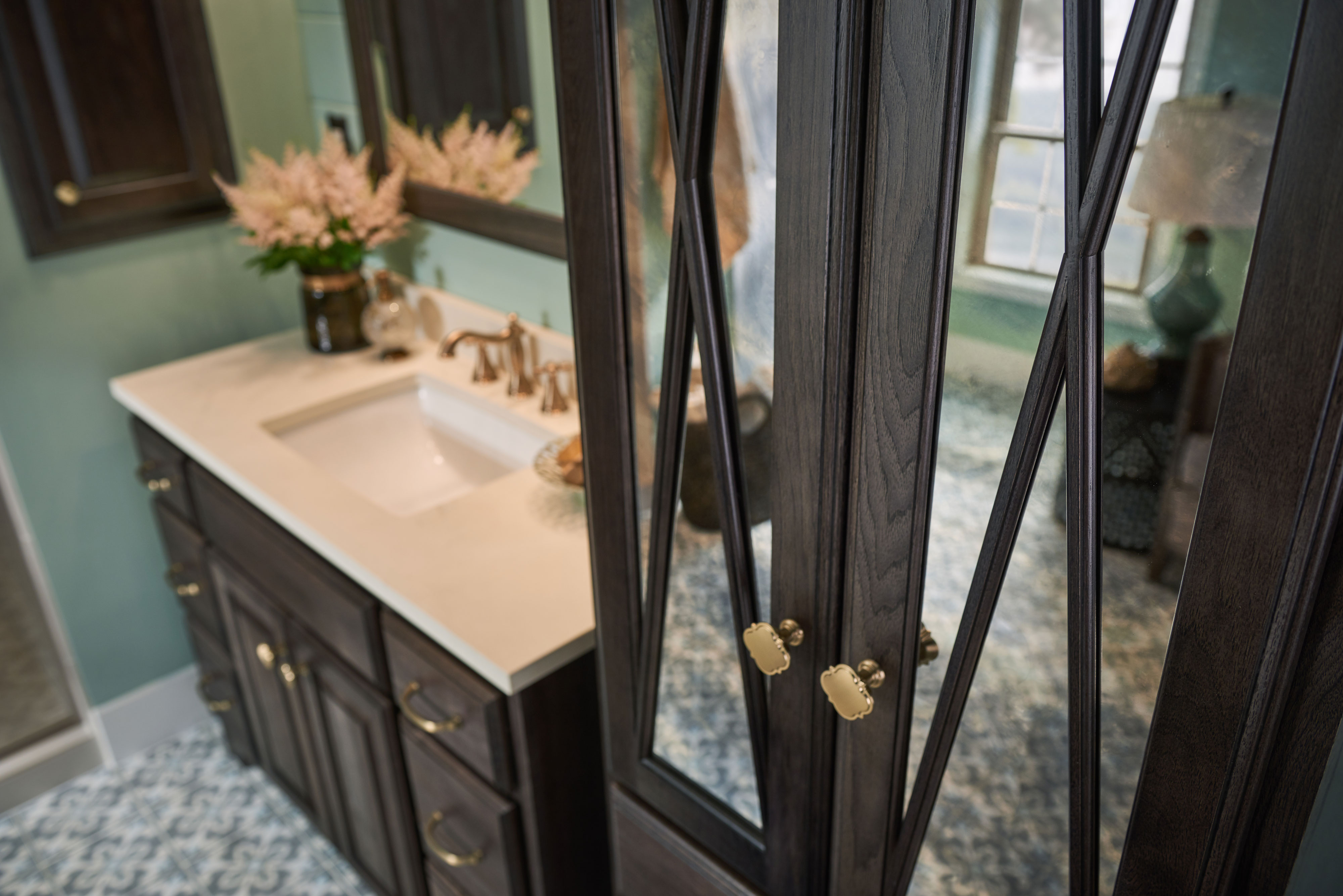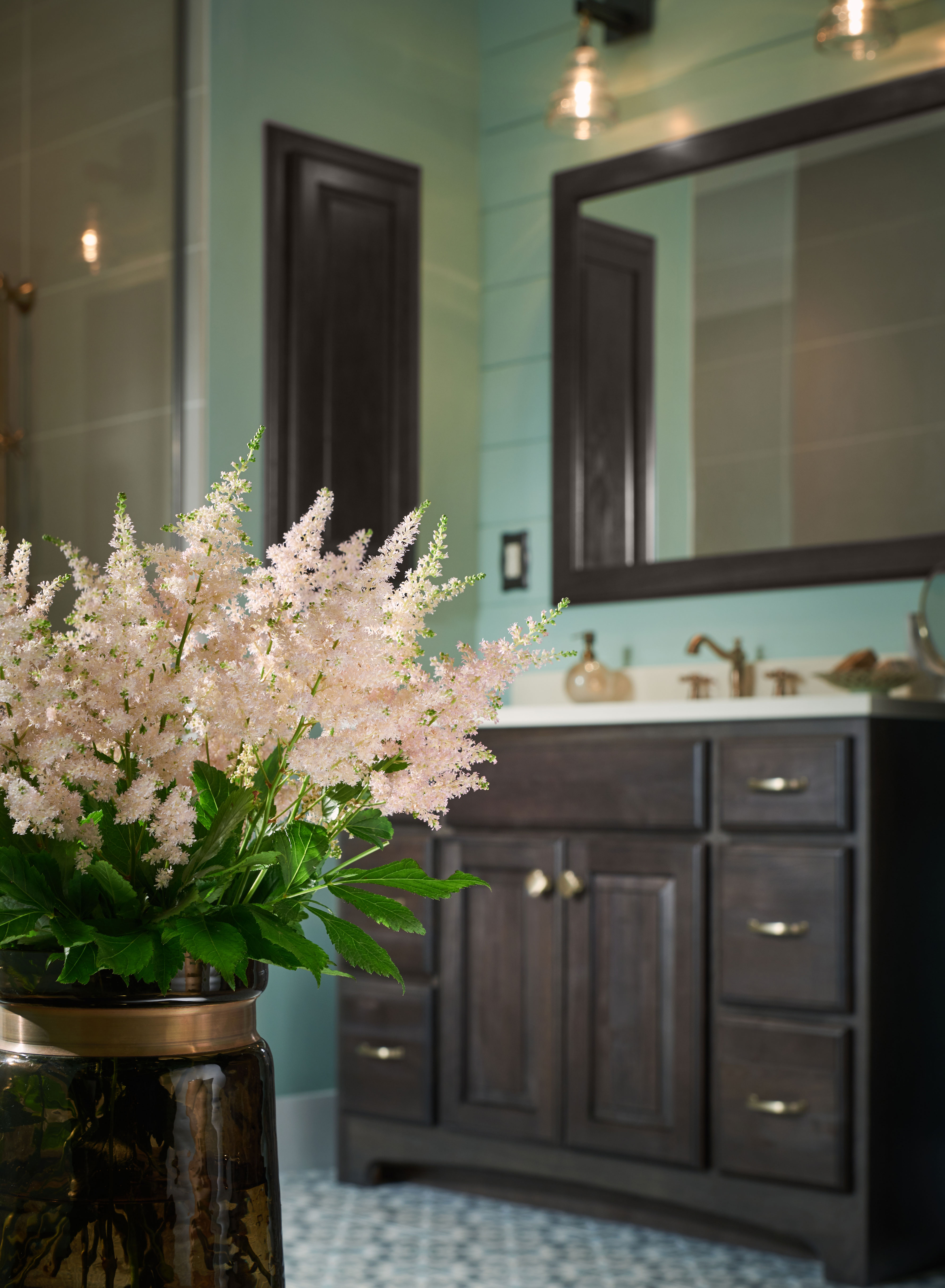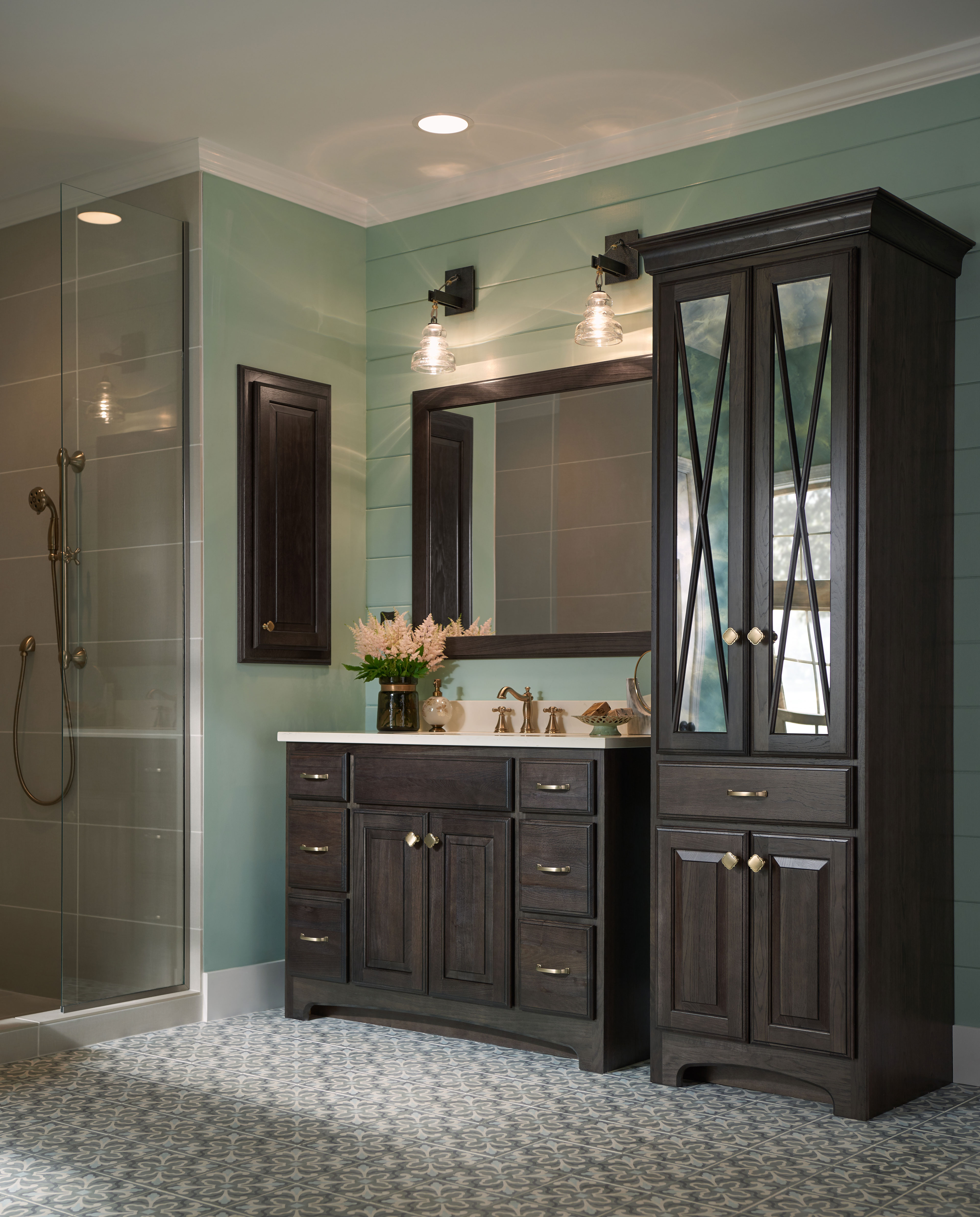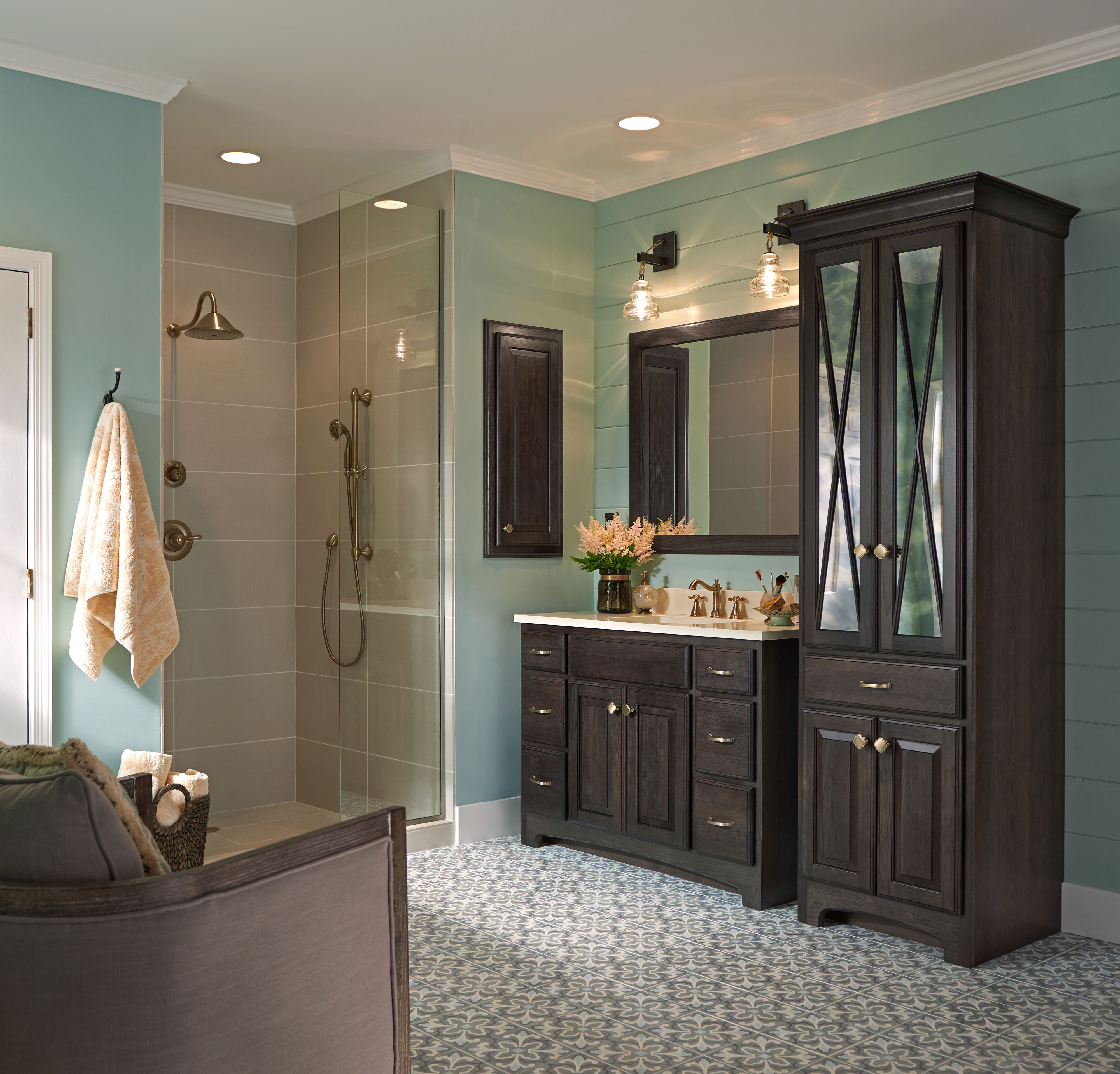 Oak cabinets in Smoke create a subtle rustic flair in this Terrace inspired bath. Brushed gold accents, shiplap walls, patterned tile flooring and a soothing color palette create the feeling of a comfortable cottage.
